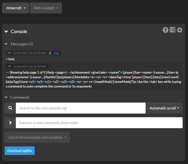 With the server configured, go to the Dashboard and pick the server "minecraft". The following shows adding a "Console" widget and running the "help" command against Minecraft: