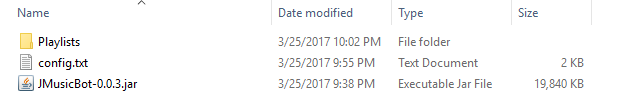 Download JMusicBot-0.0.4.jar, config.txt and example_playlist.txt. You can skip the config if you already have a previous version (backwards compatible), but there are some new options so it may be worth taking a look at the example config. If you download the example_playlist.txt, make sure to put it in a "Playlists" folder. Your folder should look like this (except use the correct version number):