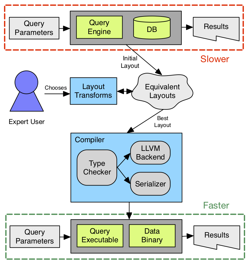 Optimizing the physical data storage and retrieval of data are two key database management problems. In this paper, we propose a language that can express a wide range of physical database layouts, going well beyond the row- and column-based methods that are widely used in database management systems. We use deductive synthesis to turn a high-level relational representation of a database query into a highly optimized low-level implementation which operates on a specialized layout of the dataset. We build a compiler for this language and conduct experiments using a popular database benchmark, which shows that the performance of these specialized queries is competitive with a state-of-the-art in memory compiled database system.