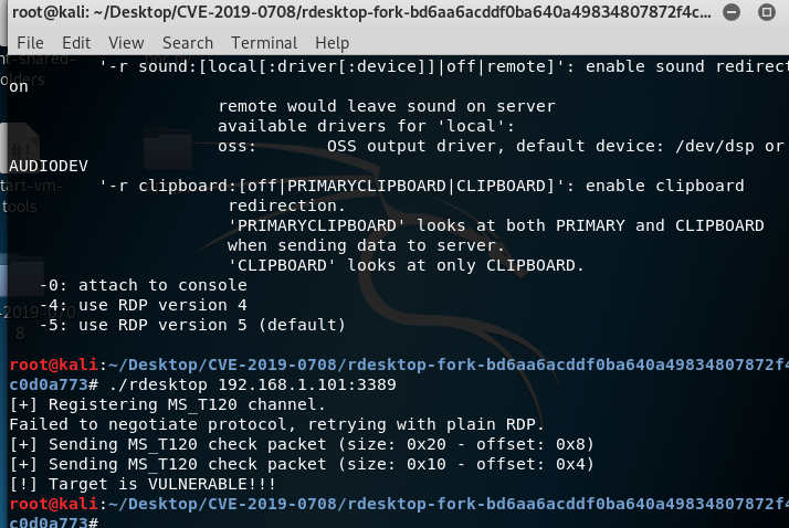 https://github.com/SugiB3o/Check-vuln-CVE-2019-0708root@kali:~/Desktop# ./rdesktop 192.168.1.101:3389 ERROR: Failed to open keymap en-us [+] Registering MS_T120 channel. Failed to negotiate protocol, retrying with plain RDP. [+] Sending MS_T120 check packet (size: 0x20 - offset: 0x8) [+] Sending MS_T120 check packet (size: 0x10 - offset: 0x4) [!] Target is VULNERABLE!!!