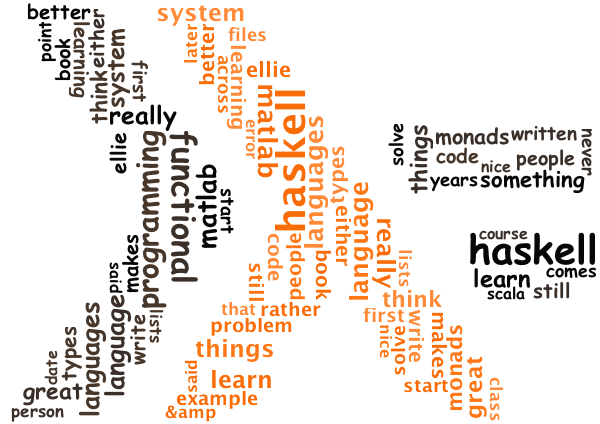 kumo --input "https://www.haskell.org/, https://en.wikipedia.org/wiki/Haskell_(programming_language)" --output "/tmp/nintendo_vs_playstation.png" --type layered --background "https://raw.githubusercontent.com/kennycason/kumo/master/src/test/resources/backgrounds/haskell_1.bmp,https://raw.githubusercontent.com/kennycason/kumo/master/src/test/resources/backgrounds/haskell_2.bmp" --color "(0xFA6C07),(0xFF7614),(0xFF8936)|(0x080706),(0x3B3029),(0x47362A)"