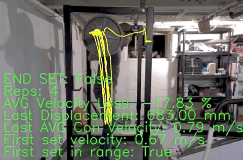 Movement of the barbell is continuously scanned to see if a lift is happening. When it detects a rep, it displays the most commonly referenced VBT metrics and informs you if your lifts are within 0.5-0.75 m/s as well as if they fall below a 20% velocity cutoff. There is an audible signal that is played of your lifts comply or fall outside of the range so you know when to terminate your set without having to keep your eyes on the computer.