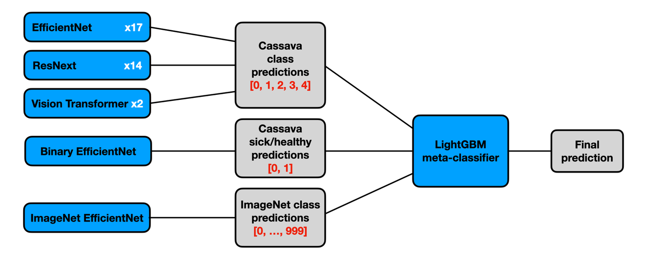 We develop a stacking ensemble with CNNs and Vision Transformers implemented in PyTorch. Our solution reaches the test accuracy of 91.06% and places 14th out of 3,900 competing teams. The diagram below overviews the ensemble. The detailed summary of the solution is provided this writeup.