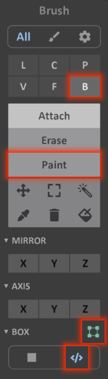 By default, Brush Shaders are used with the Box Mode, however, the Paint mode can also be used to replace voxels with the chosen color.