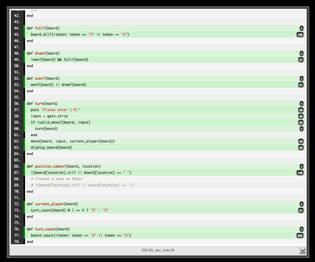 endIf we ran the test suite against that code in lib/tic_tac_toe.rb, we'd see.
