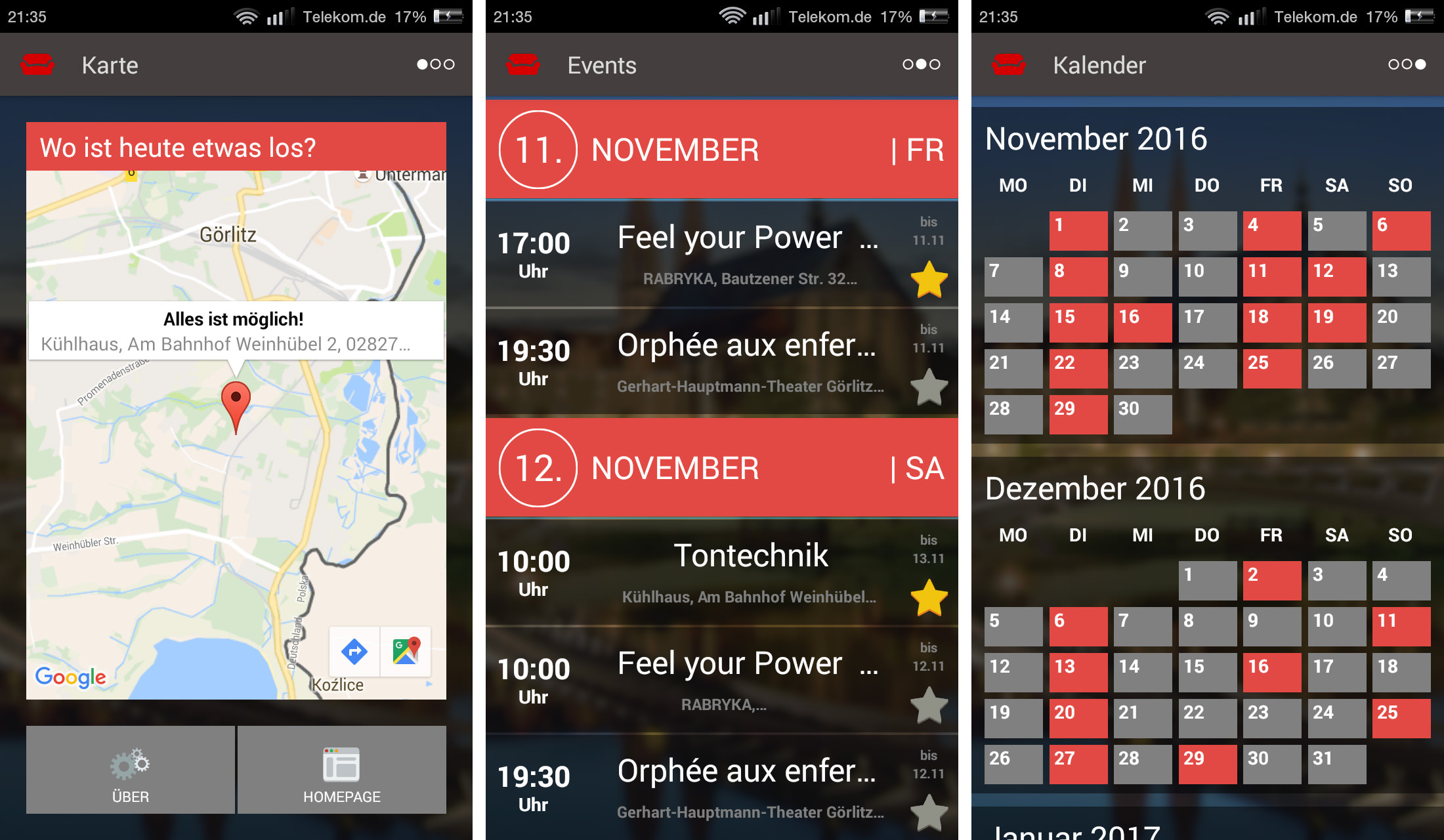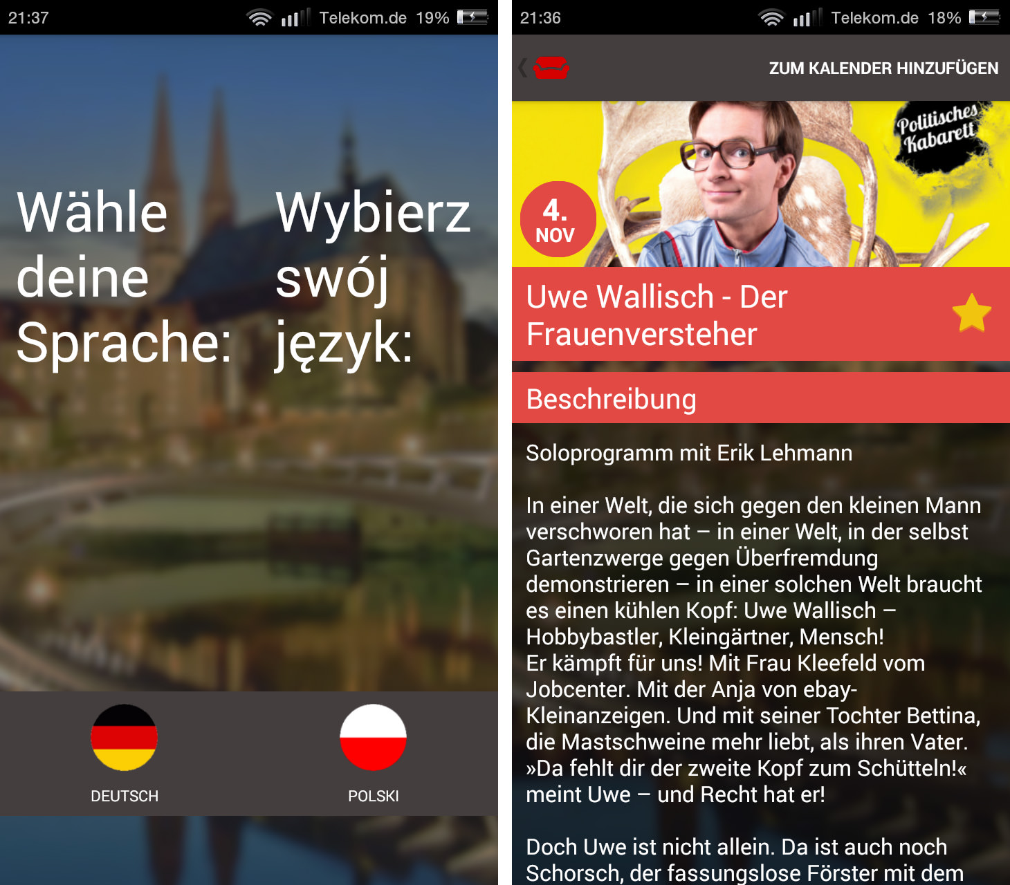 Today, Görlitz and Zgorzelec are two neighbouring cities which got seperated after the second world war. The purpose of this app was to share events beyond borders and thereby to strengthen the cultural life of this region.
