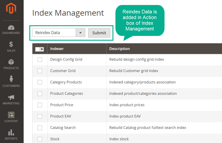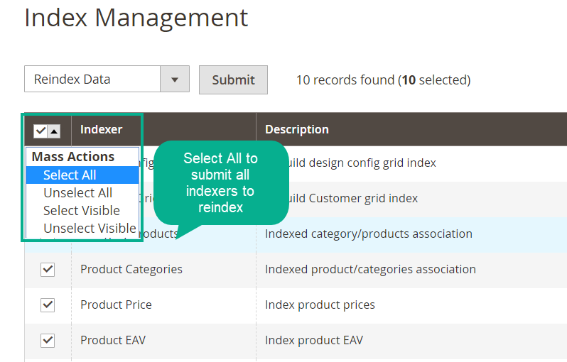 Reindex All Data allows store owners to submit data which needs to be reindexed in just one click. From the admin backend, it is easy to select all or deselect all the indexes and do actions quickly.