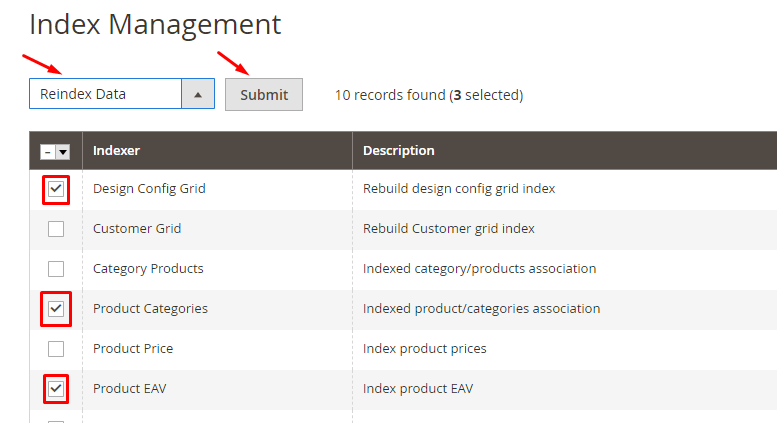 A: You just need to click to select each reindex, then click on Submit to reindex them.