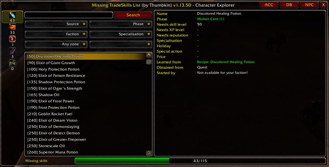 - List of all available skills & recipes with correct data for Alchemy, Blacksmithing, Cooking, Enchanting, Engineering, First Aid, Fishing, Herbalism, Leatherworking, Mining, Poisons, Skinning & Tailoring