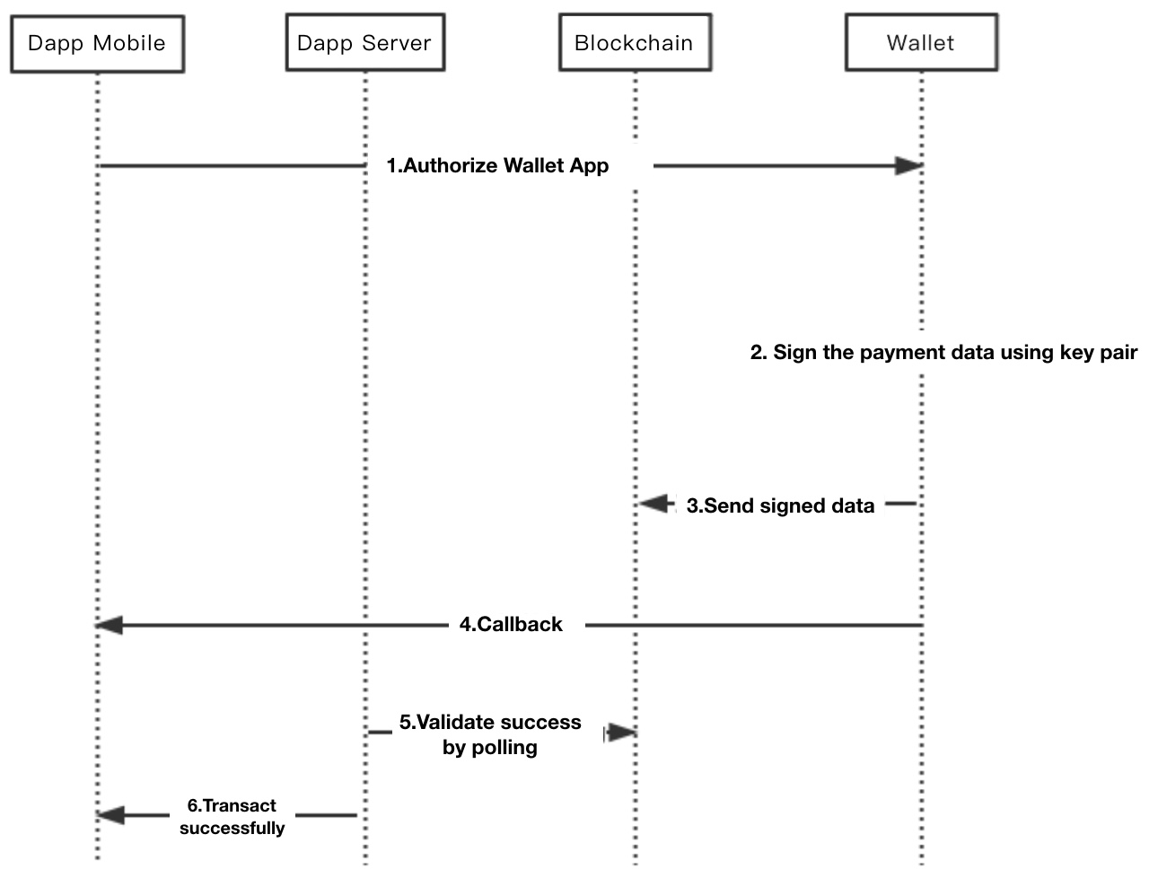 - The wallet assembles the above data and generates an transaction. After the user authorizes the transfer, the user submits the transfer data to the blockchain; If there is callback, pulls the dapp application