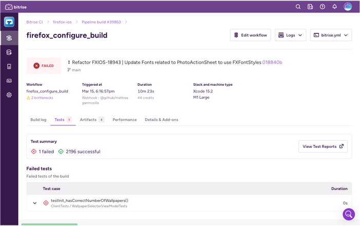 - Click Build Log for information for build failures, Swiftlint failures and any Bitrise errors.