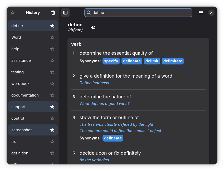 Wordbook is an offline English-English dictionary application built for GNOME using the Open English WordNet database for definitions and the reliable eSpeak for pronunciations (both audio and phoneme).