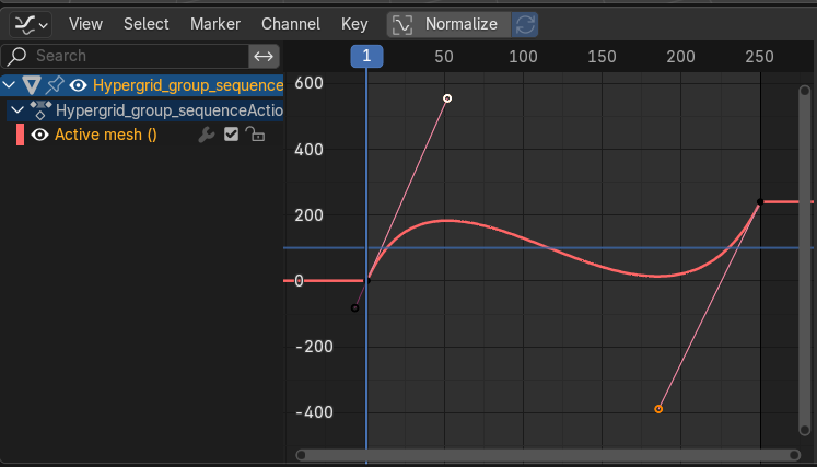 You may also edit the interpolation of the Active Mesh field using animation curves. When at least one keyframe is set on this field, the Active Mesh curve will appear in Blender's Graph Editor view when the mesh sequence is selected. See Editing F-Curves
