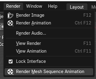 No special care is usually requried to render an animation of a Cached sequence. Simply hit Ctrl + F12 or click Render > Render Animation. If, for some reason, Blender crashes while rendering, try locking the interface before rendering: Render > Lock Interface. While not strictly requried, it is good practice to render to still frames instead of directly to videos so that you don’t lose progress if Blender crashes.