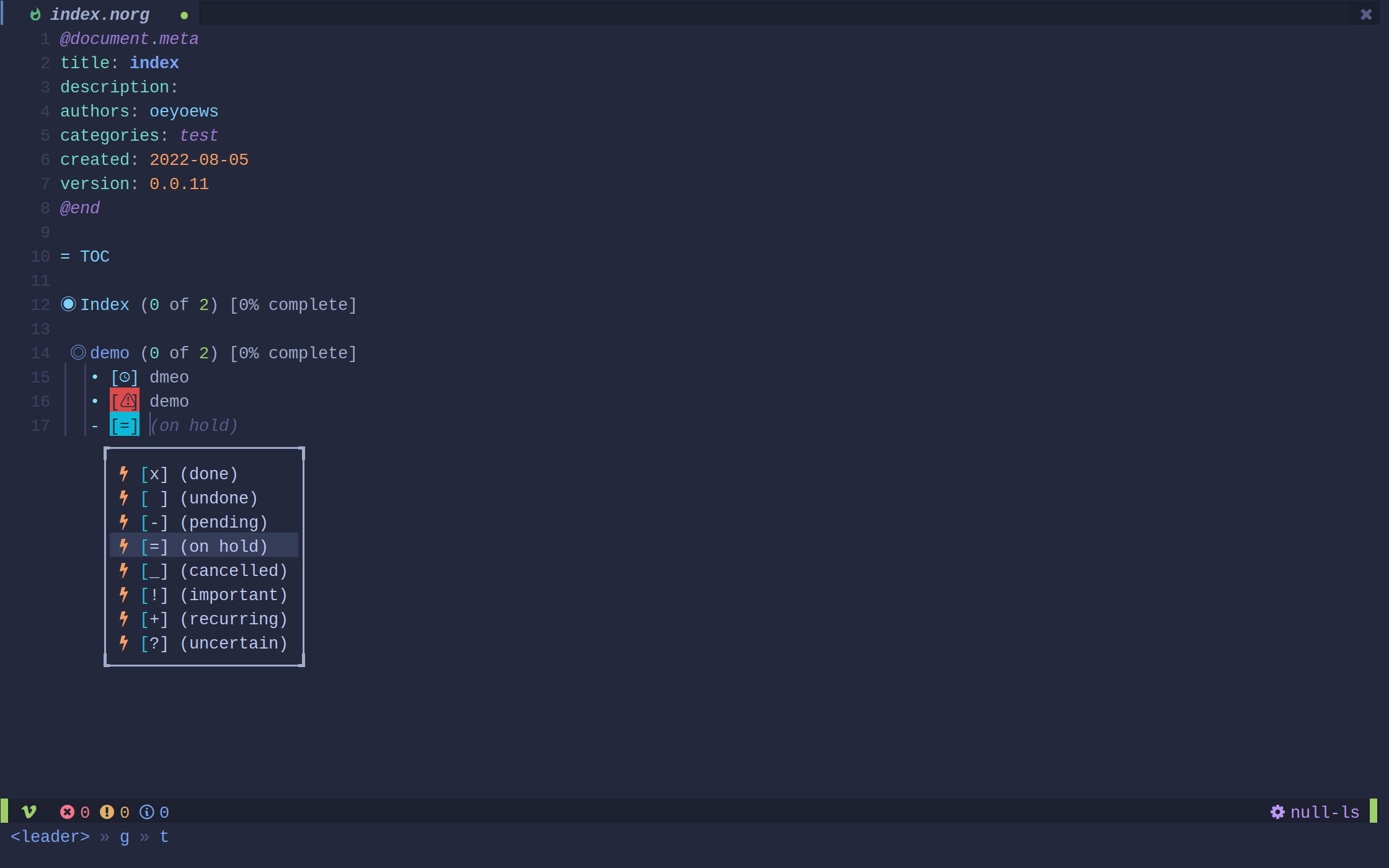 { neorg_leader .. "mn", ":Neorg mode norg<CR>" },