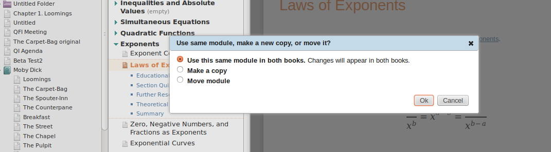 Currently the book editor has a shelf/picker that facilitates copying content from one book to another. But the original design called for the ability to either move the content, copy it, or make a link such that two books share the same content. We orginally tried to determine likely scenarios and circumstances such that we could guess the most likely author intent and make move, copy, or link the default in that case. After much exploration, we decided that determining the best default and communicating that to the author so they could feel confident in predicting why things occurred was too difficult. So with one exception, we settled on asking the author every time. The exception is when moving content within a single book, which will always be a move. Because rearranging content from other books isn't that large a part of writing a textbook, we felt the additional ask was worth the simplification in the model.