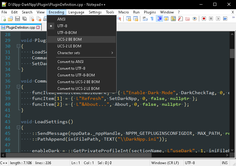 Notepad++ plugin that allows to use partially dark mode on Notepad++.