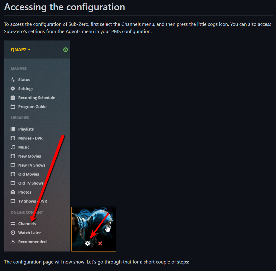 The install documentation seems a bit outdated. The documentation says to go to 'Channels' to configure Sub-Zero but that does not seem to be the way to do it anymore. Now to configure Sub-Zero you would go to Settings > Plugins.