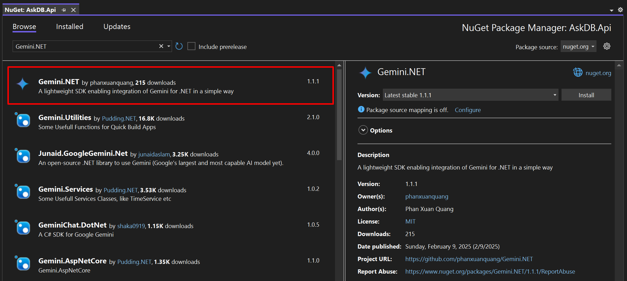dotnet add package Gemini.NETFor more detailed instructions, visit the Gemini.NET's NuGet Gallery page.