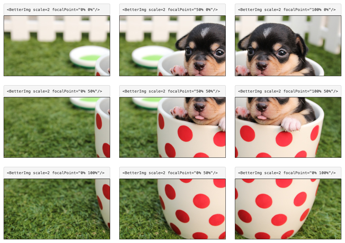 focalPoint: default=50% 50%(work if resizeMode = 'cover') Decides origin of the where to focus on the image,scale: (work if resizeMode = 'cover') if provided, the image will scale from container width. (Not image original width)- scale = 1, the image will cover the whole area precisely.