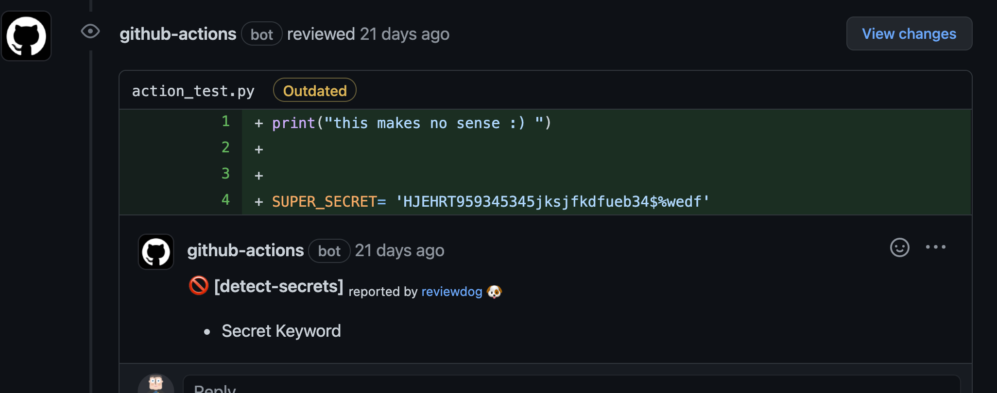 For more details please see reviewdog/action-detect-secrets and detect-secrets