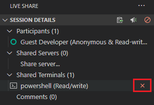 in the terminal or by clicking the Remove Terminal icon in the shared terminals list inside the Live Share viewlet.