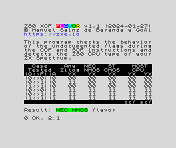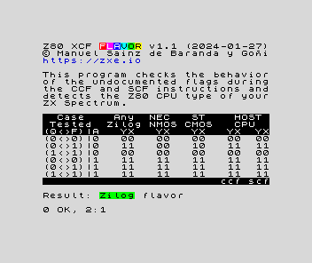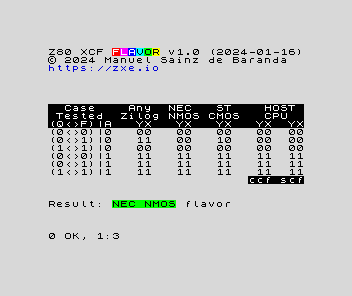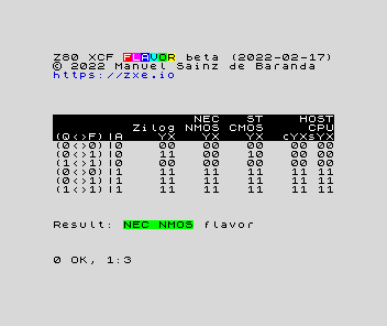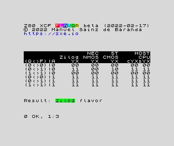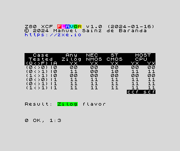 Z80 XCF Flavor displays the values of YF and XF after the execution of ccf and scf for every possible combination of states of Q, F, and A. The left column represents the values of each factor (1 is used to indicate that bits 5 and 3 in the factor are set to 1, due to the limited space on the ZX Spectrum screen). The central columns labeled "Any Zilog", "NEC NMOS", and "ST CMOS" show the reference values of YF and XF on those CPU variants for both ccf and scf. Finally, the two columns on the right display the values of YF and XF obtained on the host CPU for ccf and scf separately.