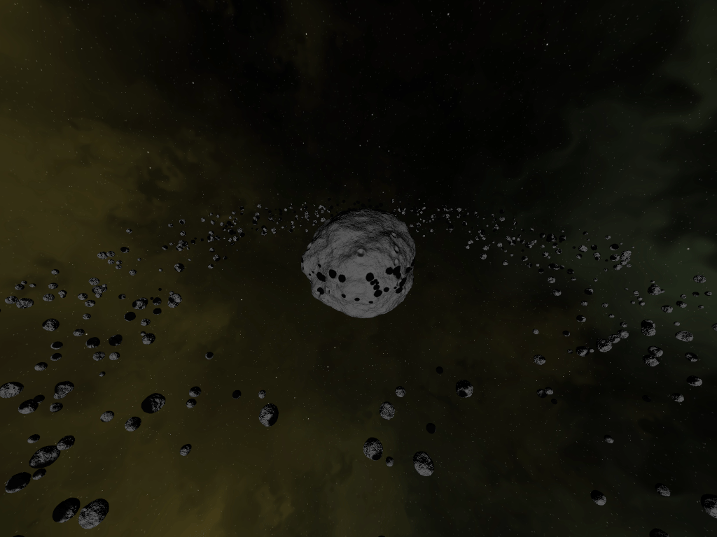 The main asteroid as well as the smaller belt asteroids both have procedural terrains (generated using Perlin noise function) as well as bump mapping for more realistic terrain look. Additionally, main asteroid has procedural craters that can be regenerated at runtime.