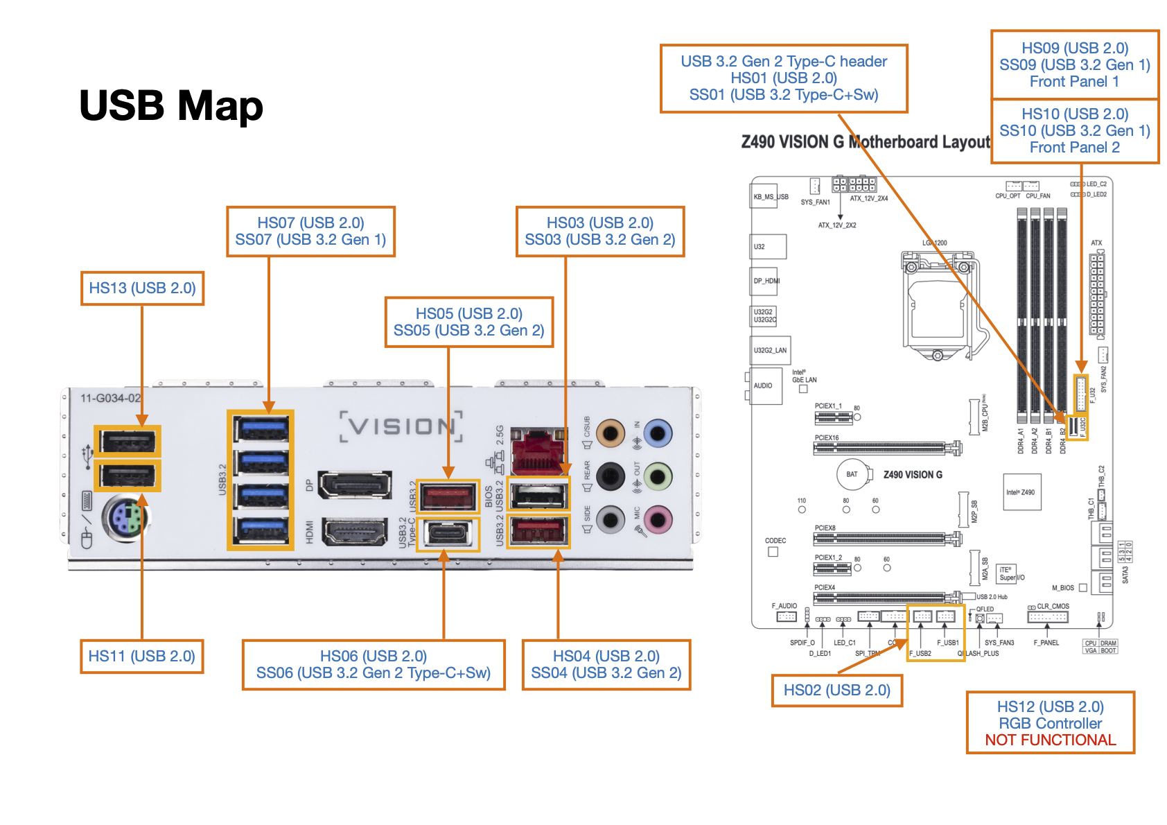 All USB ports work except the two next to the ethernet port (HS03/SS03 and HS04/SS04). I needed another USB-C port on the front of my case + a USB 3 port + a USB 2 port so I had to disable those 2. If you don't need front IO (or use a different PC case) you can use USBInjectAll.kext
