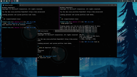 I fell in love with new Windows Terminal, but didn't find any solution to "store app in tray" - hide terminals window, and call it using ShortKeys. I found some applications, but they were too big for my needs. So I wrote this little app, to resolve my problem. And here we are. For now Termial Tray is everything that I wanted. Maybe in the future MS add this Quake Style feature to Windows Terminal, but for now this little tray app is enough for me. And I hope that'll be enough for you too.