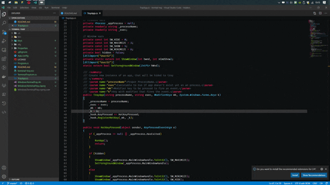 Simple .NET app that hides app window (not minimize) and restores them using hotkeys. (using .NETFramework Version v4.7.2).