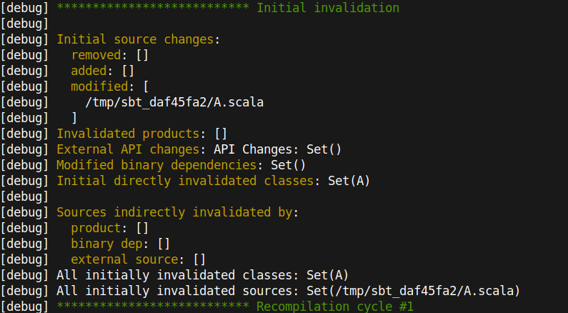 I think this is an area where we could immensely benefit from better tooling, and I'm not sure logging is the best way to approach this problem (though the changes in this PR are great). Logs are useful for debugging, but most realistically this debugging will be done by maintainers of the repository that are already familiar with the internals, so bad-formatted output can be born. What if, instead, we try to make this output be more useful than just debugging concrete problems? My dream as a maintainer would be that we use this data to try to reproduce complicated incremental compiler bugs. We don't have reports of these bugs nowadays, which is good on the one side but concerning on the other one: debugging Zinc is difficult, requires concrete knowledge, and most of the bugs happen while software developers try to fix a bug or ship features in their applications. What if people are just ignoring incremental compiler errors and cleaning their builds when they happen? I'm pretty certain this happens to some extend, so diagnosing problems with the incremental compiler in an automatic or semi-automatic way would be a big win. What I have in mind is the possibility of adding an internal Zinc module that would serialize all the incremental compiler debug data shown in the terminal to a protobuf file (or possibly the same analysis file) -- the most important part is that the contents of this file are accessible in memory to the build tool in case it wants to use it. The protobuf file would contain all data about the incremental compiler runs. The idea would be that people that just run into a normal incremental compiler error like I think this approach could be more interesting than just prettifying the debug output of the incremental compiler and would have far-reaching positive consequences in our community. @lukaszwawrzyk What do you think about this idea? Would you like to contribute it to Zinc? |