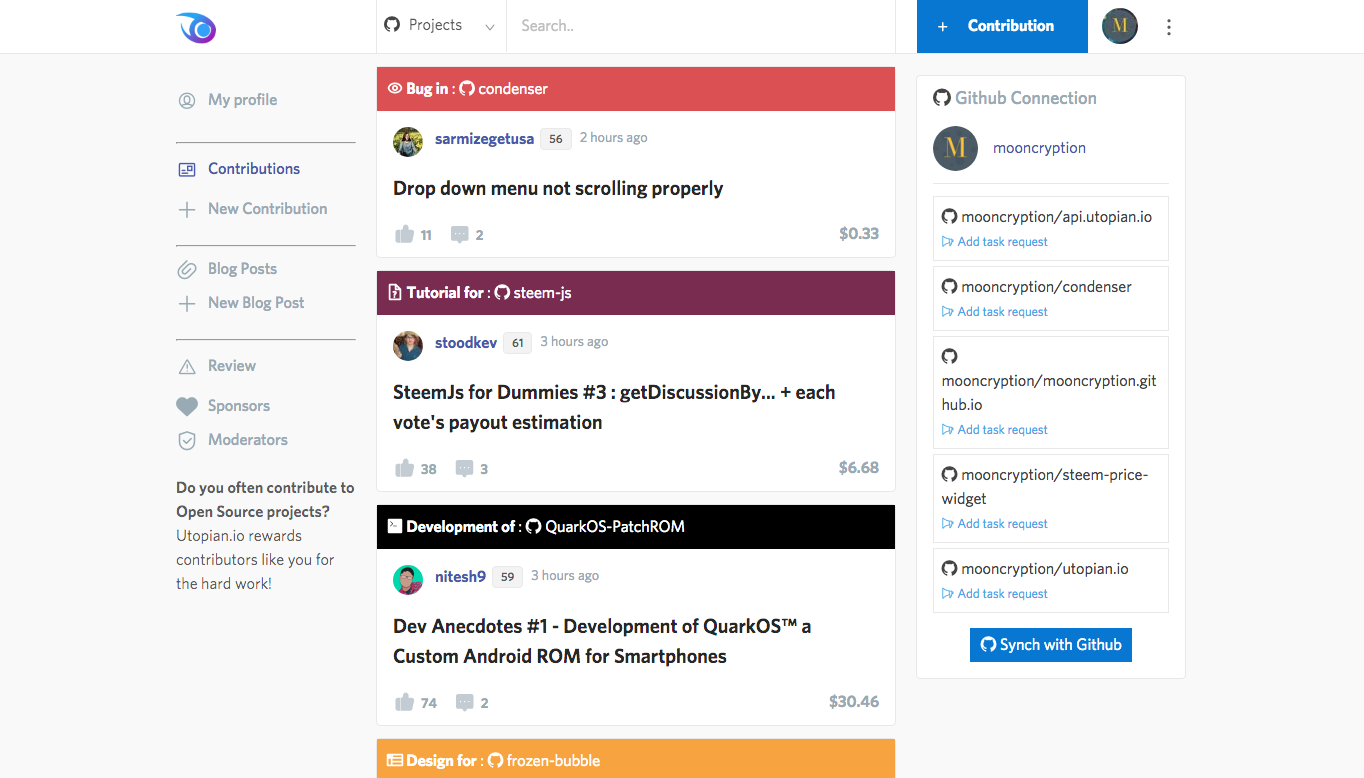 Utopian.io wants to reward Open Source contributors for their hard work. Forked from https://github.com/busyorg/busy, Utopian uses the STEEM Blockchain to reward contributors in cryptocurrency.