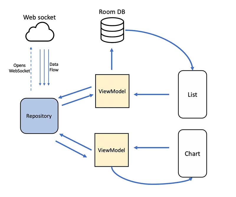 The architecture used for this application is MVVM. The activities use viewModel functions to open a websocket channel via a repository. The data received from the socket is sent to the viewmodel using Flows. I have used flows here because we have the data coming at a regular interval and we have to make sure that the data is updated only when the app is ready. Flows are known for handling back pressure, the producer emits the data when the collector is ready. The data is saved to local DB when received. The list is then updated via DB. The DB helps to contain old data even when the new ones are received. I have used Kotlin language along with Hilt for dependency injection, Room DB for local storage, Databinding with binding adapters and Coroutines.