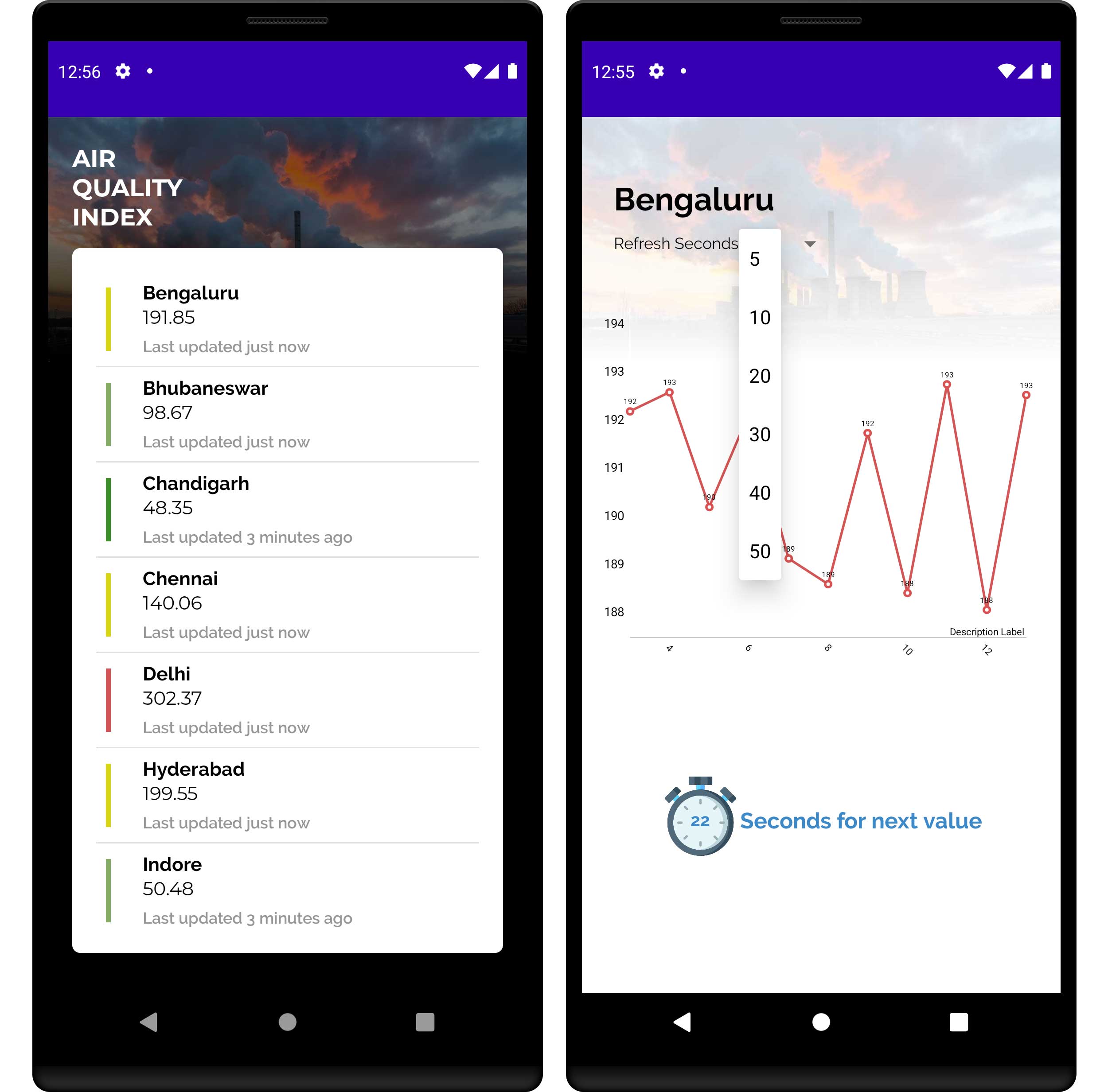 AQI application shows the Air Quality Index of indian cities. The data is refreshed realtime. The application allows us to see realtime chart of the data at custom interval. It took 2 and a half days to complete the app. The background used in the app is self designed in Adobe photoshop.