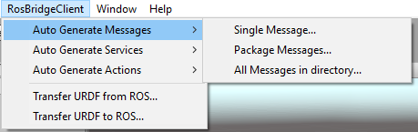 Select the appropriate submenu under the RosBridgeClient > Auto Generate Messages/Services/Actions menu, depending on the input file type. You can choose to generate a single message, messages of a package or all messages under a directory.