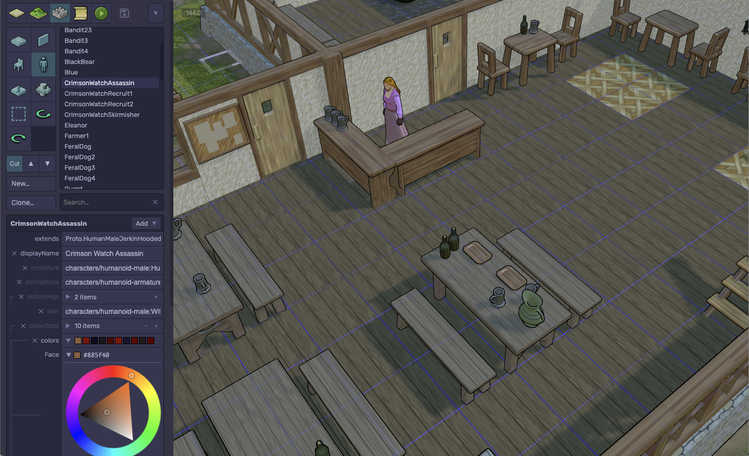 Here's an example of a goal for an NPC inkeeper working in the kitchen - this goal is a "component" which represents one small facet of that character's behavior. This involves (a) walking over to the work table (scenery interaction), (b) looking in the direction of the table's 'use' mark, (c) equipping the kitchen knife, (d) animating a chopping motion with the knife for 4 seconds, and finally (e) putting the knife away: