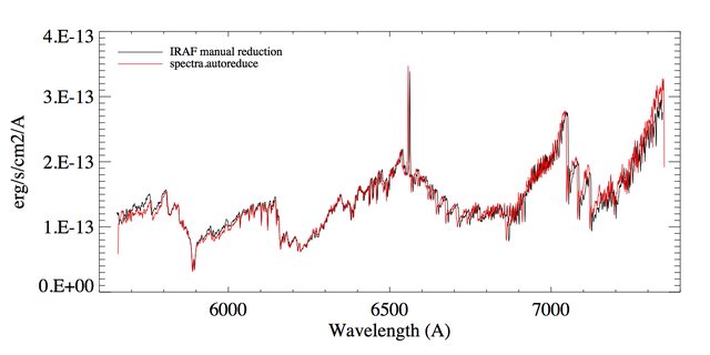 So far SPECTRA can do a rough job of all the reduction tasks for single point sources objects! We are seeking more data to test it against, to help refine the solution and find bugs. Here is one example of a totally hands-free reduced M dwarf spectrum versus the manual IRAF reduction: