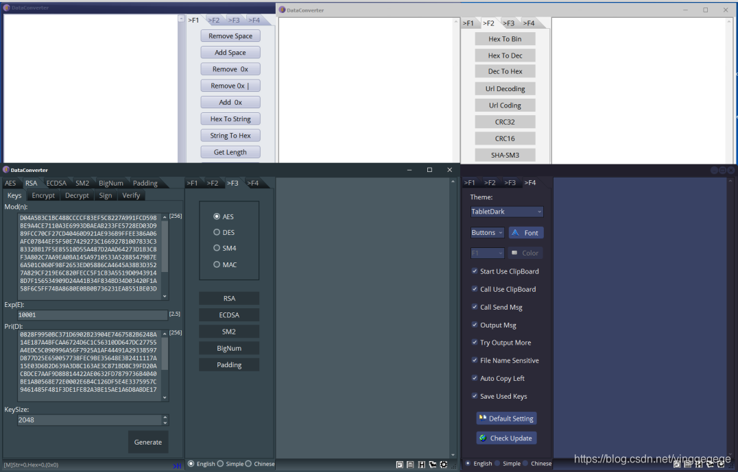 - RSA (512-8192bits) PKCSV2, PKCSV1, Nopadding填充加解密, 可生成RSAKey, 签名和验签支持多种Hash算法。