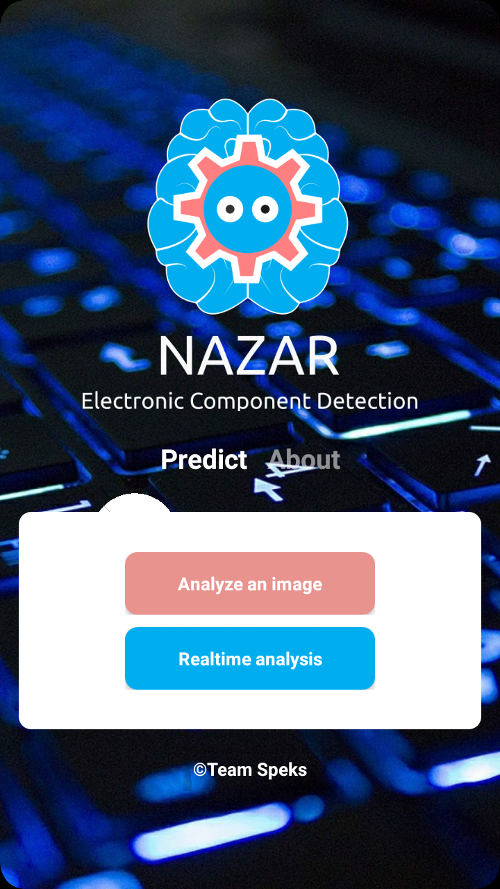 Nazar is an app built with react-native with a little spice of Tensorflow InveptionV3 which allows the user to take a picture using the camera or fetch image from gallery to identify the component with the predicted percentage ratio, thus using image processing and algorithm to segment them after detection along with fetching description about the detected component using Octopart API whose response is sent from the nazar-server itself.