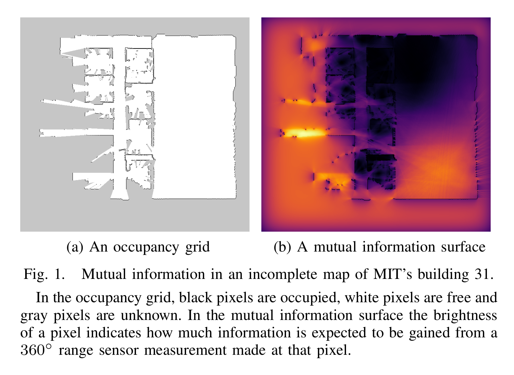 In rviz the occupancy grid map will be displayed on the topic /map and the mutual information surface will be displayed on the topic /mi_map. The topics names, number of range measurement beams and other parameters are available in the launch/params.yaml file. By running the node/mi_grid_heatmap.py script, the mutual information surface can be saved as colored image like the one above.