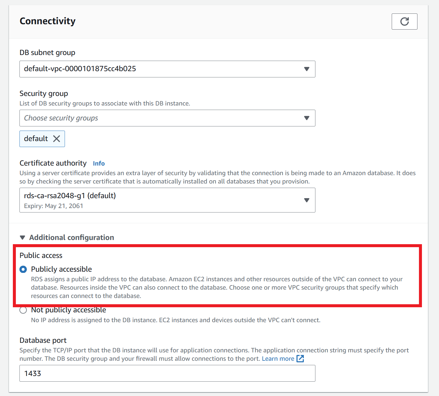 After our database state is shown as Available, we will now make the database accessible publicly. Select the database and click on Modify. Once on the new page, scroll down till you see the subtitle Connectivity. Then click on Additional configuration and select Publicly accessible. After such actions, click on Continue and within the Schedule modifications select Apply Immediately and select Modify DB instance.