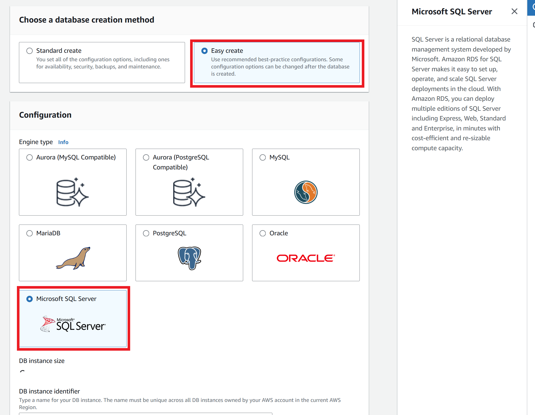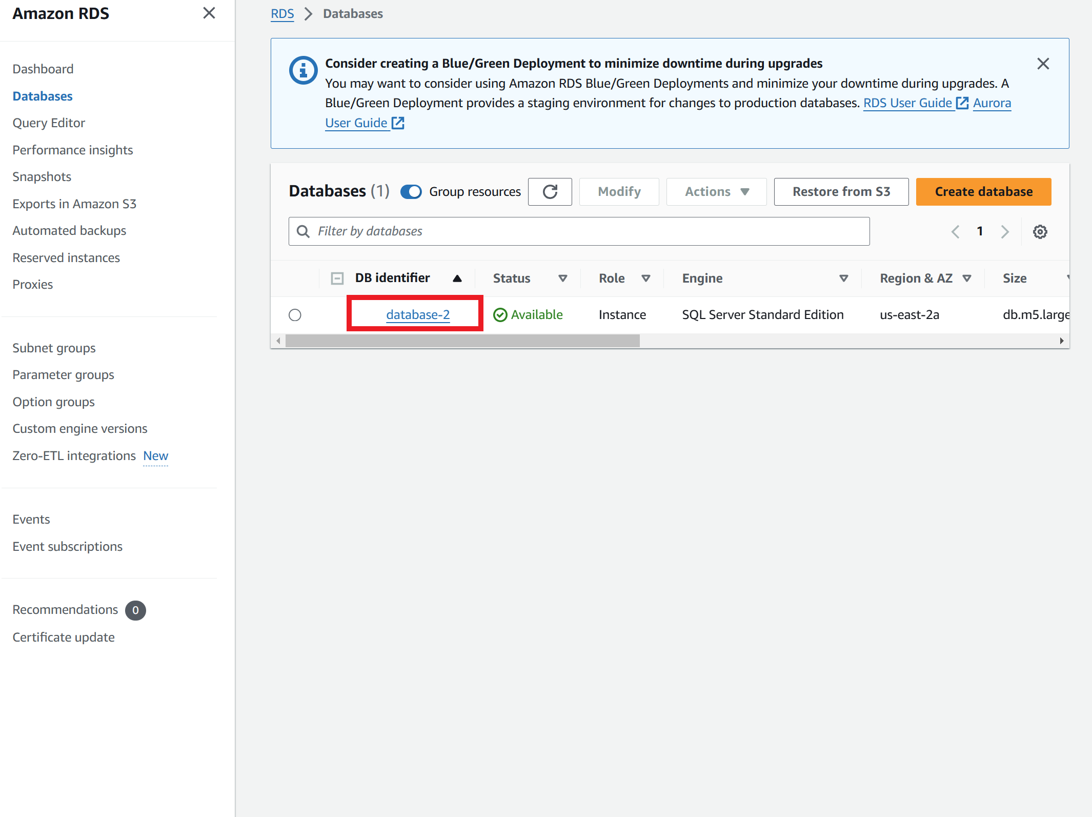 Once on Amazon RDS, click Create Database. On the new webpage, Click on Easy create, so that best practices will be used and the DB will be overall simpler to set up. Next, for the Engine Options select Microsoft SQL Server. After choosing the Engine Option, we will be selecting which DB instance size to use, for this example I will be using the Dev/Test. Choose the correct DB instance for what you will be using the DB. Next is the DB instance identifier, which is the name of the DB, this can be the default "database-1". The Master username is the login ID name for the admin of the DB, set it as something that you can remember such as "admin_s". Next is Credentials management, which gives you options on how to handle the master password. In this tutorial we will create a Master password. Set this password to something you can remember. After all the changes have been made, click on Create database, and wait approximately 10-15 minutes for the database to be created.