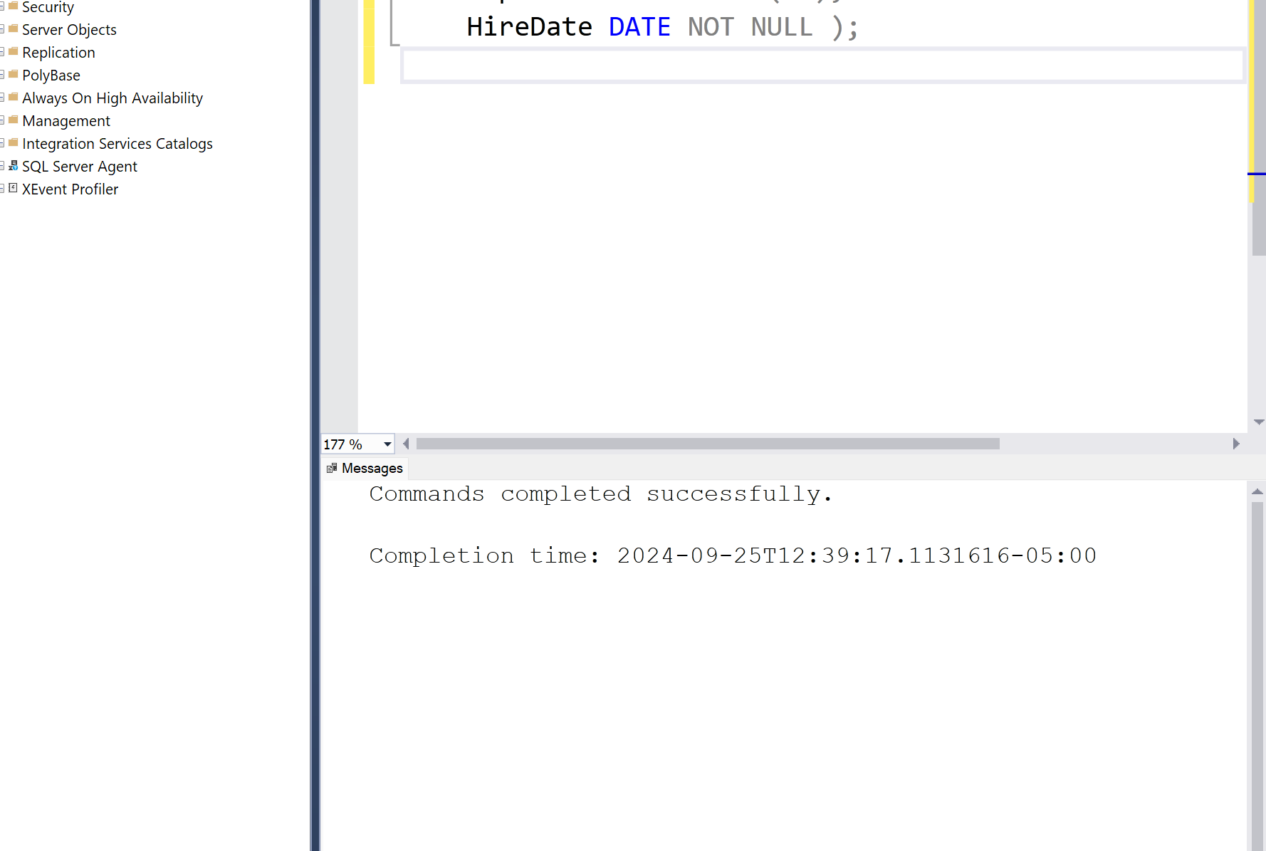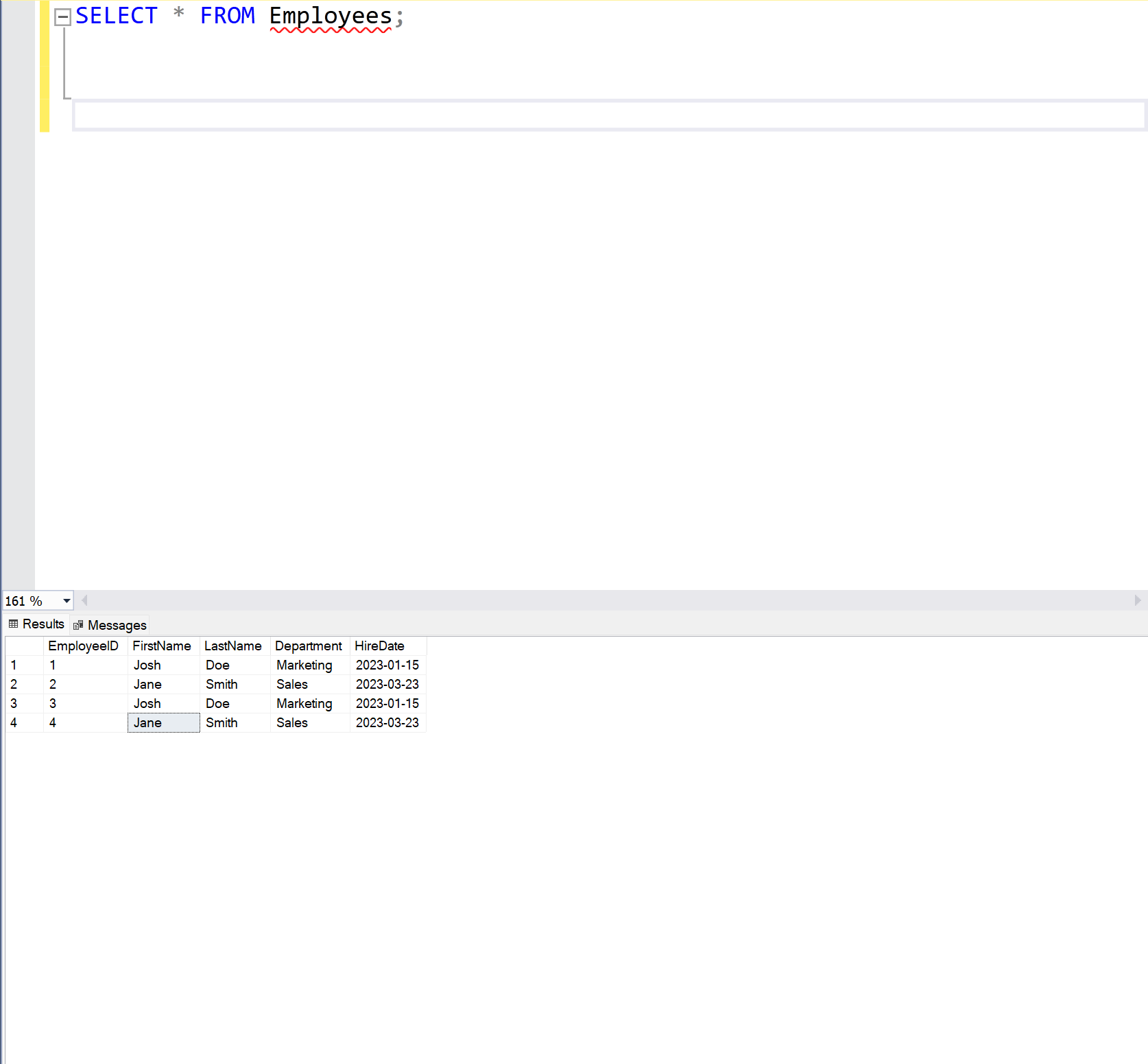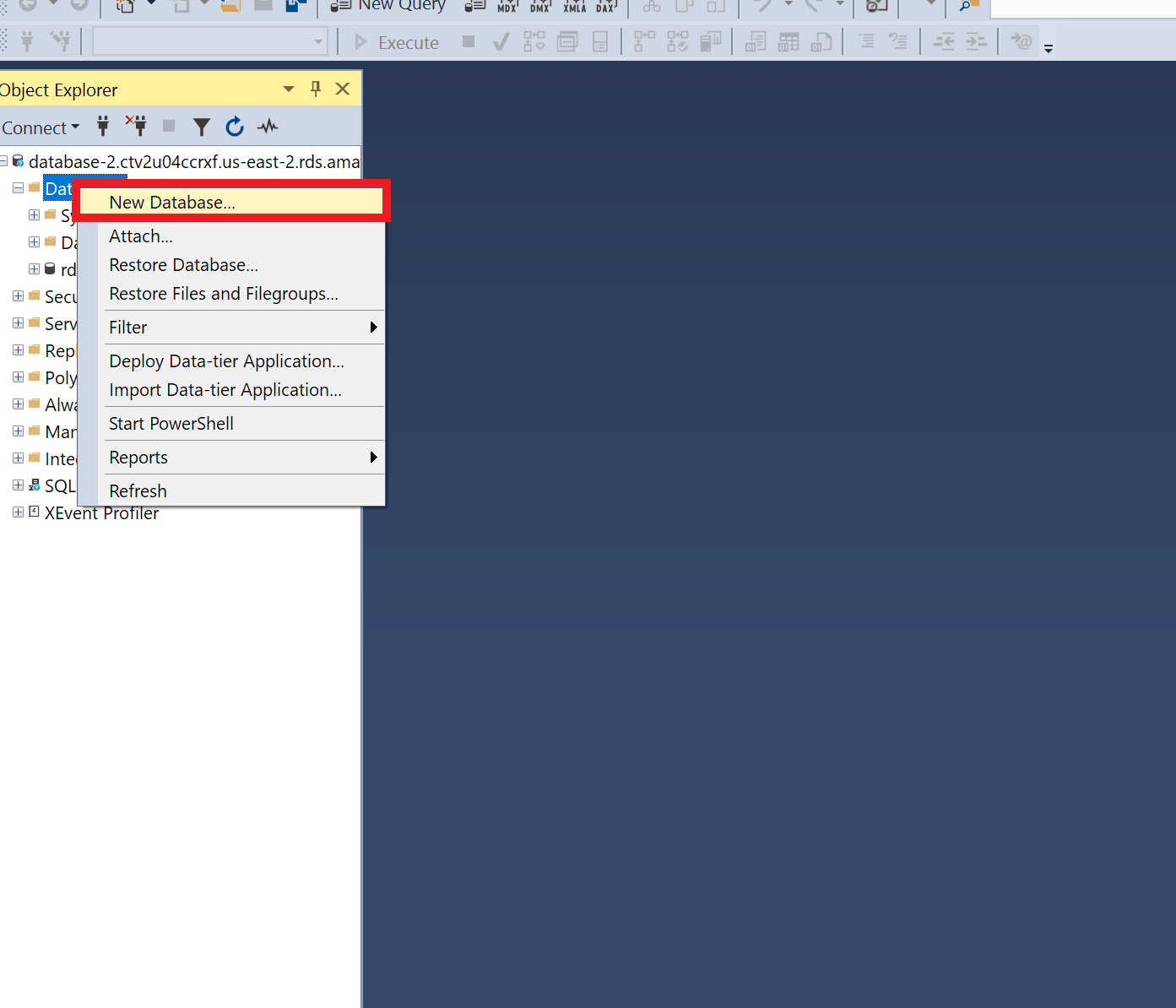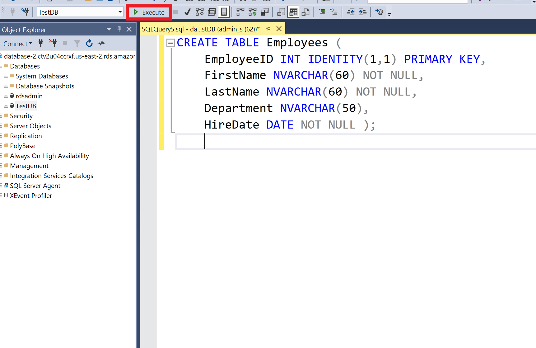To create a new database within the AWS RDS Instance, right click on Databases and select New Database.... A new window will appear, type in the name of the database in Database name: and select OK. Next, click on your new database to select it and then click on New Query to begin modifying the DB using SQL commands. Now with the Query tab open, you are now able to create tables. For this example, I will create a table called Employees with columns: EmployeeID, FirstName, LastName, Department, & HireDate. Here is the following code for the Employee table. CREATE TABLE Employees (EmployeeID INT IDENTITY(1,1) PRIMARY KEY, FirstName NVARCHAR(60) NOT NULL, LastName NVARCHAR(60) NOT NULL, Department VarChar(50), HireDate DATE NOT NULL );. The EmployeeID is set as the PRIMARY KEY, as this column is going to have the values that uniquely identify the table. This column is to only have data type INT or Integer values (...-2,-1,0,1,2...), as well as IDENTITY(1,1), this allows that each employee has an automatic EmployeeID, starting with 1 and increasing by 1. The FirstName column, as well as the LastName & Department, use the NVARCHAR data type. This datatype is a variable character datatype, which means the column can be filled with up to the amount of characters within the argument, so NVARCHAR(60) allows up to 60 characters in the column. Lastly, for HireDate, the data type is DATE, which means the data in this column is in the data format YYYY-MM-DD. Also, the NOT NULL constraint means that the column MUST be filled when inserting or making changes to the table. After typing in the code, click on Execute. Once executed, a tab will pop up showing whether the commands were completed successfully. To insert values into the database, you can use the INSERT INTO command, where you type the table you want to insert the values, the columns you want to insert, in order of how you created the table. Here is an example of inserting values INSERT INTO Employees (FirstName, LastName, Department, HireDate) VALUES ('Josh', 'Doe', 'Marketing', '2023-01-15'), ( 'Jane', 'Smith', 'Sales', '2023-03-23');. To check the tables values you can use SELECT * FROM Employees;, where the * is a wildcard and basically means to select ALL from the table Employees, this shows you the table at the bottom of the app. Since I accidentally added copies of the employees, I will use the command DELETE FROM Employees WHERE EmployeeID IN (3, 4); which will remove the typos. After this command you can use SELECT * FROM Employees; to show the table again.