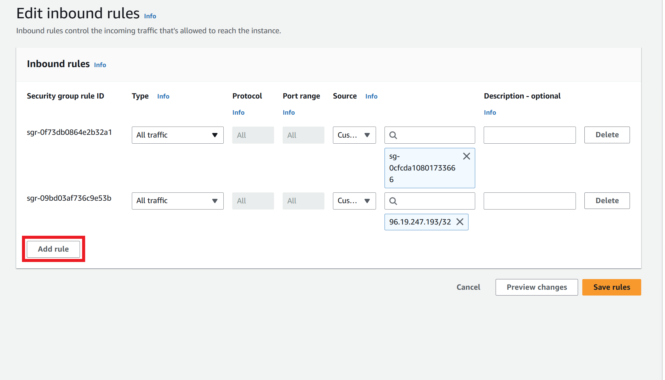 Next we will configure Security Groups (the set of rules for the firewall). To begin, click on the DB identifier. Next, make sure you are on the Connectivity & security section. Once there, click on the link under the VPC security groups . In the Security Groups click on the security group, once clicking on the group a tab will open on the bottom of the page where you will click on Inbound rules. Next, click on Edit inbound rules. Once there, select Add rule, a new row will pop up where in the type section, select MYSQL. Within the Source you will have the option to either input your computers IP address, so that only your computer will be able to access the DB, or selecting Anywhere-IPv4 so that when using a hotspot or when using another ISP you are able to access the DB. Finally, select Save rules .