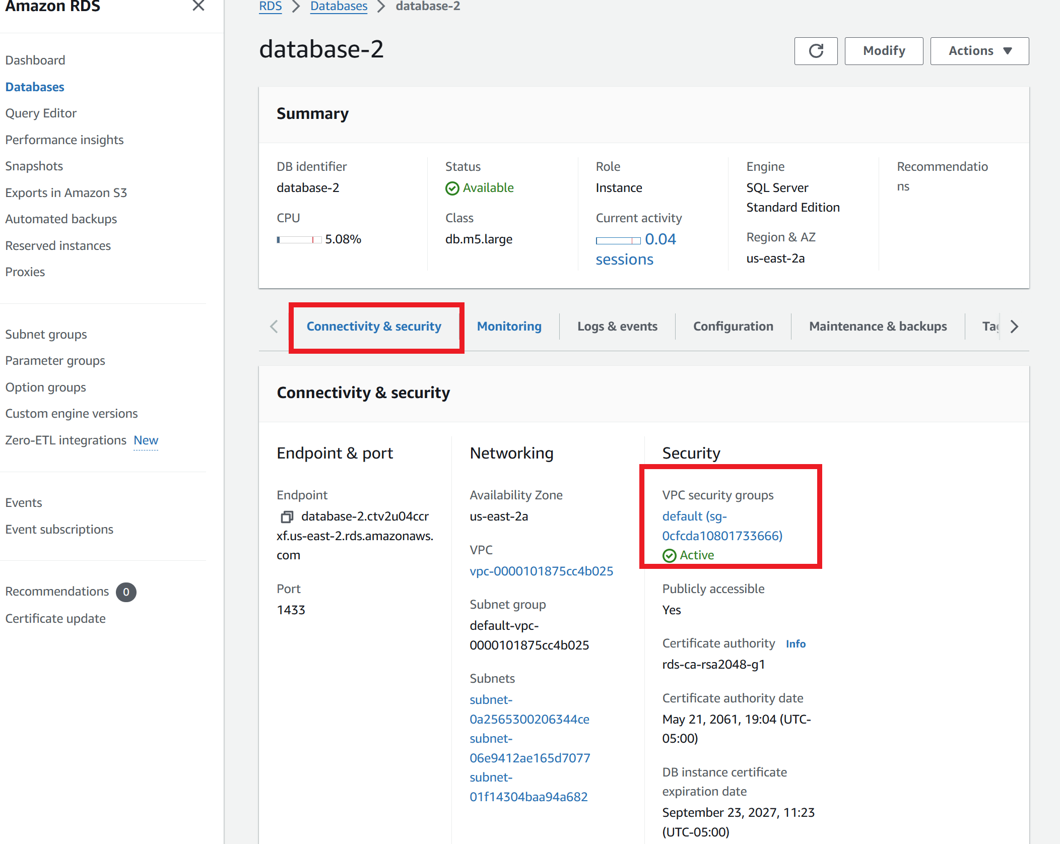 After these changes, what is next is to download SMSS if you have not already. I have added the link to Microsoft's website to download the application. Once downloaded, open the application. Then go back to the amazon RDS website and click on the database instance again and select Connectivity & security, once there copy the Endpoint & port information. Next you need to locate your Master username and Master password to sign in, if you forgot you can go to the Configuration to see your Master Username. After having all this information, go back to SMSS and make sure you are on the Login tab. once there you will input your endpoint name and port after using a , in the Server name section, for example database-2.************.*********.rds.amazonaws.com,1433. For authentication, you will select SQL Server Authentication. For the Login section you will input your Master password that you have created, as well as your Master password within the Password section. Make sure Trust server certificate is checkmarked; otherwise, you will not be able to access the database. Select Connect and wait for the database to connect. Once connected successfully, you will be able to see all the folders within the database.