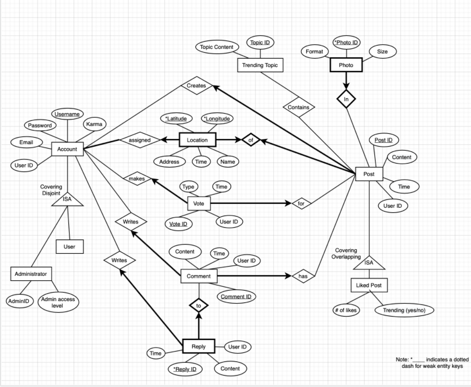 We will focus on the users and posts of this social media community. This includes things like the user information (eg. The user’s name, email and other private info), what posts they have posted, what posts they have saved. There will be subcategories for different types of posts to let users browse more efficiently (eg. posts with the same hashtags will be grouped together, while hot topics will include the trending posts). Moreover, each post will include a geotag that shows the location when it was posted (eg. the longitude and latitude and an option to check out the location on google maps). There will be another entity called reply for existing comments on a post, which then acts as a weak entity.