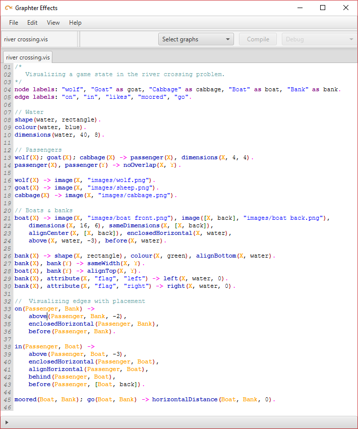 Graafvis may be considered as "shorthand Prolog with special predicates". A .vis-script contains simple logic rules that define relations between two domains: the input graph and the output visualization.