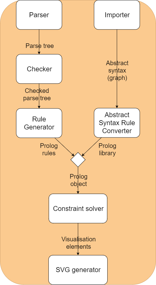 Both the Graafvis script and the graph file are loaded and checked for errors. They are then converted to Prolog rules and a Prolog library.