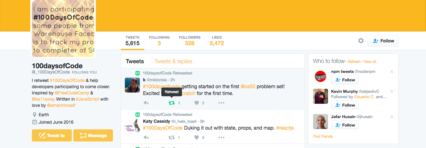 Helping Developers who code and participate in #100DaysOfCode share and communicate through Twitter.
